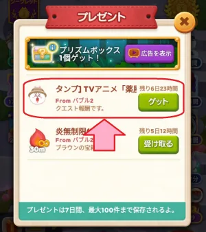 ホーム画面右のアイコンから「受け取る」をタップして、左下のプレゼントボックスよりゲットしましょう。