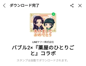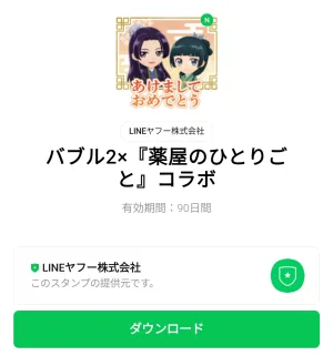 12月23日に出た無料スタンプ、「LINEヤフー株式会社」の「バブル2×『薬屋のひとりごと』コラボ」をダウンロード方法やこの無料スタンプを実際にゲットしてトークに使う方法を解説しています