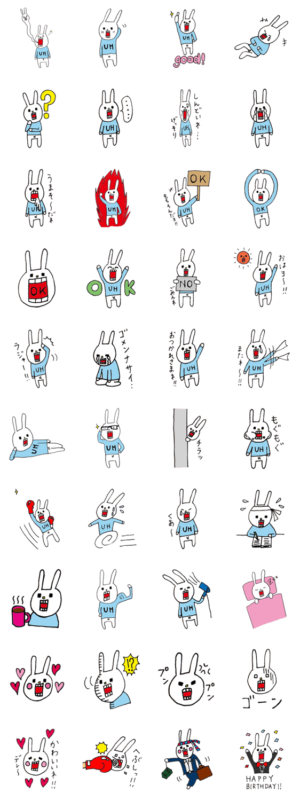 ウサギのウーのLINEスタンプです。とぼけたかおで、たのしいトークのお手伝い。【ウサギのウーです】ウサギのおとこのこ。からだとおなじいろのズボンをはいている。NIKUQ WORKS より発売