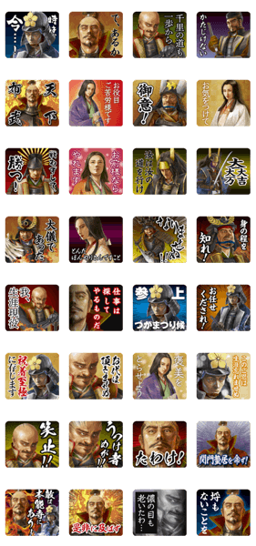 斎藤道三、織田信長、明智光秀を筆頭に、斎藤義龍、濃姫、柴田勝家、お市の方、豊臣秀吉、ねね、石田三成、徳川家康、築山殿、本田忠勝の全13人が彩る超美麗スタンプです。