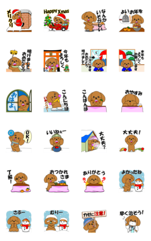 寒い冬の挨拶に使えるトイプードルのスタンプです。年末年始の挨拶も入ってます。
