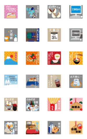 年末年始に関わる色々なものが動いて挨拶します。花びら餅、大掃除、除夜の鐘、PC等々。中華まんや飲み会など普段に使えるものも有り。キャラなし、大人向け。きのこのシマ より発売