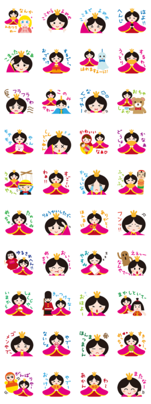 ひな祭りにしか登場しないおひな様がスタンプになって365日大活躍!世界の人形たちと一緒にあなたのライフを楽しくするよ!