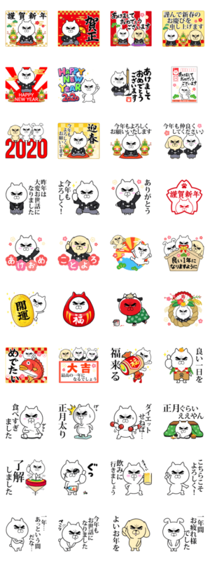 目ヂカラにゃんこの2020年のお正月・年末年始スタンプです。毎年使えるスタンプも多数入っています。