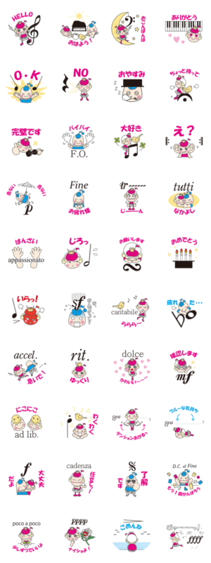 音楽が大好きなあなたへ!楽譜によくある音楽記号を使ったスタンプをピアノの先生が作りました。お教室のキャラクター、プリンセスポポちゃんが日常へ音楽をお届けします。popopiano より発売