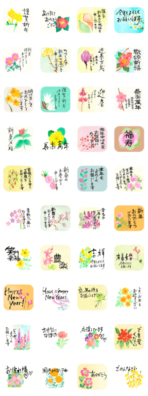 水彩画と筆文字で年末年始のごあいさつ スタンプ画像一覧