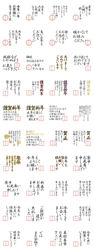 文字が大きく敬語がたくさんあり、印鑑のように苗字を入れることができます。会社の上司や先輩、後輩にも使える年末年始の挨拶です。