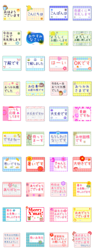 フラワーカードのような敬語のスタンプ。主にカード型の花のモチーフと言葉のみのシンプルな大人向けデザイン。年間行事用のスタンプも。5文字までのお名前入れ可能