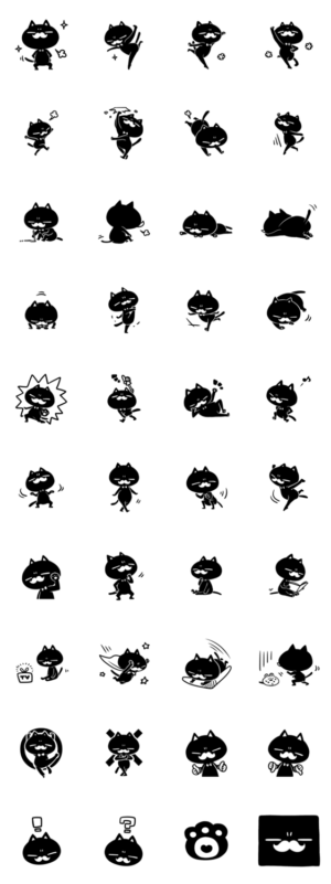 シンプルでちょっとシュールな【白髭黒猫】のスタンプです。文字なし・白枠あり。irico より発売