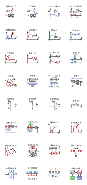 制御工学のスタンプがついに登場!!古典制御と現代制御の基本概念を日常生活でも楽しもう。工学を学ぶ学生や、エンジニアにオススメです。M.D. Lab. より発売
