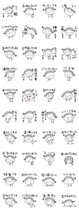 くるりんとした髪に赤いリボンの女の子。今回はお仕事編。「お世話になります」「直行します」から「残業です」まで。お仕事メッセージをくるリボンにお任せしよう。