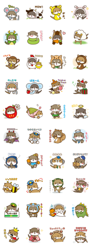 コスプレに忙しいかわうそ達。 干支/ハロウィン/クリスマス/お祝い/チアリーダー/酔っ払いサラリーマン/着物/天使/恐竜/運転手/配達員/博士/忍者/フラダンスMingo KANDA より発売