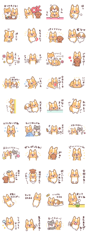 まるまるコーギースタンプにころころ柴犬、ふわふわシーズー、ふわふわもこもこトイプードルがやってきました!思いやりのある優しい言葉で励ませる「気づかい編」です。