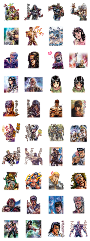 大好評の「北斗の拳」スタンプ第2弾!人気の強敵(とも)、ザコキャラも満を持しての大量ラインナップ!伝説の名シーンと名セリフを使いこなして、アイツの秘孔を突け!(株)コアミックス より発売
