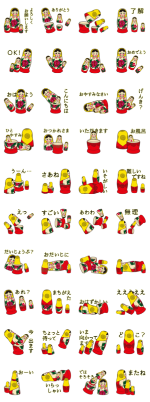 ロシア民芸品の入れ子人形マトリョーシカで、開けたり閉めたり並べたりして遊びながらご挨拶。セミョーノフ村の典型スタイルの一つで小さな3個組人形を描きました。Yoshihara Rei より発売
