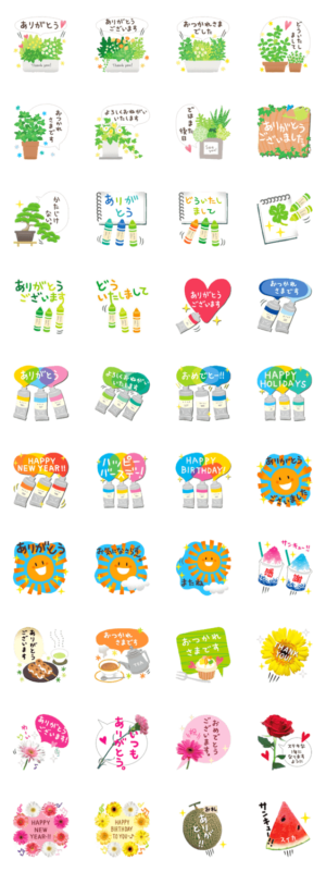 「ありがとう」が多めのスタンプ集。今は販売していないスタンプの使いやすい単語を選んで再編集。母の日のカーネーションの写真や薔薇の写真、お祝い用スタンプもあるよ。