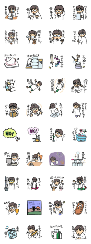 実験室・研究室で日々奮闘する理系学生の日常の様子をスタンプにしました。※ちょっと化学系よりです