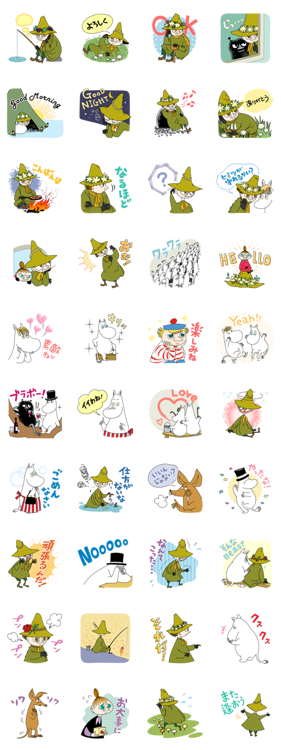 ムーミンの親友、「スナフキン」の毎日使えるスタンプが登場!使いやすい相槌や挨拶もいっぱい。ムーミンやムーミン谷の仲間たちもいるよ!