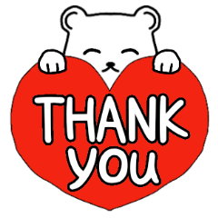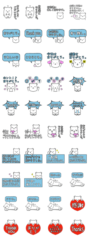 絵文字もあり。かわいいシロクマさんのスタンプ。感謝を伝えるスタンプ。ありがとうや感謝。【作:とりいかおる】