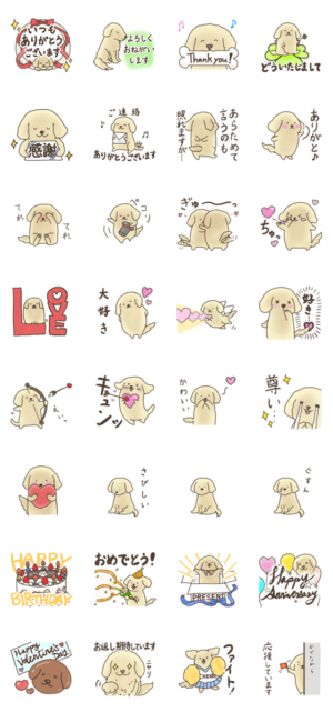 もふっとわんこ(一応ゴールデンレトリーバーらしい)が、感謝・ラブ・応援など様々な気持ちを伝えます。日常だけではなく、誕生日やバレンタインデー、記念日にも。