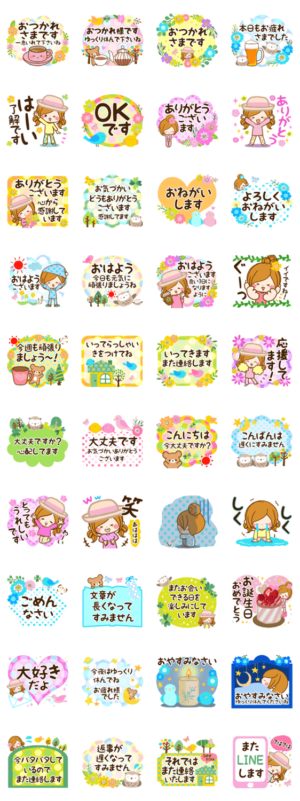 カラフルで気分が明るくなる、やさしい言葉がいっぱいつまった手描きスタンプです。鳥やお花がいっぱいで、心がほんわか癒されますように♪ 「ほのぼのカノジョ」シリーズ