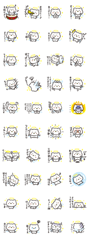 指先に舞い降りてきた、とてもちいさなクマの天使のスタンプです♪上半分が日常会話系で、下半分が自分ツッコミ系のハーフ&ハーフ仕様。オノフミスタンプ第1弾