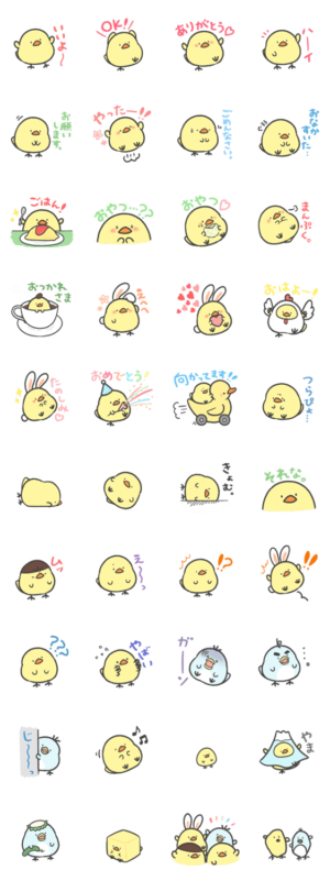 ひよこのこたちのスタンプ。 文字入り・ひよこ多めで、 使いやすいものからそうでないもの(!?)まで詰めました!みゆたんこぶ より発売