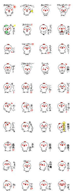 ひよこのようなにわとり「にわぴよ」第1弾。まるくて小さいにわぴよの毎日使えるあいさつや相槌の日常会話編。後ろにつけると 敬語になる「です。」スタンプもあり。