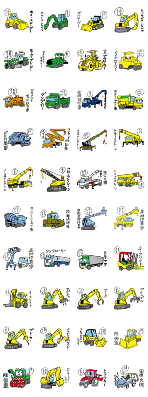 働く車が勢揃い。工事現場で働く重機や特殊車両、運搬車や農業車両など仕事場で頑張る車のスタンプです。現場間の情報交換や子供たちに見せてあげたり、使い方は色々。GOZAWA より発売