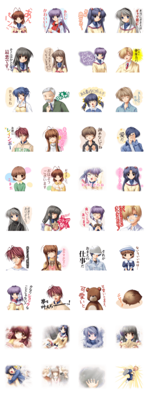 TVアニメや劇場アニメになった全年齢対象ゲーム『CLANNAD』のオフィシャルスタンプです。にぎやかなスタンプで友達と楽しいトークをしちゃおう♪Key より発売