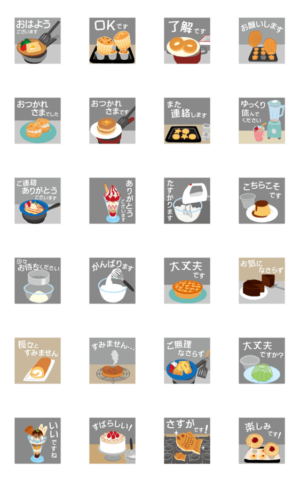 お菓子作りの、混ぜる、焼く、揚げる、などの動きと共に文字が出てきます。日常の挨拶にどうぞ。キャラ無し、敬語で大人にも。「料理すると文字が出ます」スタンプ第2弾。