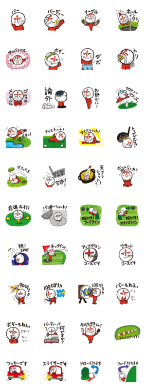 楽しいラウンド後、反省会で良く出る言葉をスタンプにしました。ターゲットスコアは、80後半~110位です。大多数のゴルファーが、楽しくライン出来る素材に仕上げてますFive children より発売