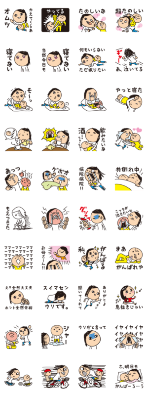 新米ママ育子さんのハードな日常!毎日頑張るお母さんたちに贈る、リアル育児スタンプです。デザイン・サンライト より発売