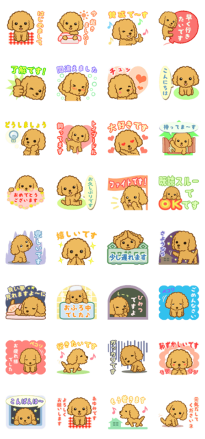 可愛いプードルのスタンプです。性別:雌 毛色:アプリコット 日常のあいさつなどキュートな犬のスタンプ盛りだくさんです。