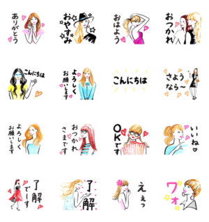 オシャレでモードな女の子が、表情豊かに挨拶します。 ファッションイラストで、オシャレにスタンプ 第二弾。ふらわーず より発売