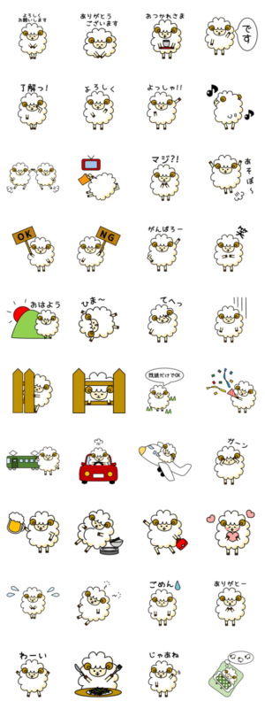羊の干支スタンプが日常会話に使えるようになってリニューアル。キュートなひつじの文字入りスタンプです。最後につけると敬語になる「です。」も!