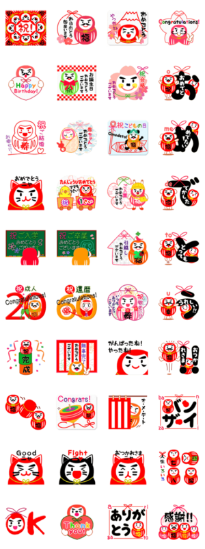 和ヒゲの縁起ダルマが結婚、出産、一歳、子どもの日、入園、入学、卒業、合格、成人、敬老、還暦、引越し、完成にあたって、敬語や丁寧語でお祝いと幸運を届けます♪Anya&Nyao(あにゃ&にゃお) より発売
