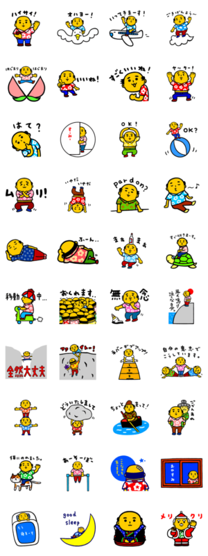 沖縄のアキラちゃんが、スタンプになりました。自慢のかりゆしウェアで、元気いっぱいいっぱいです。一般社団法人なは市場振興会 より発売