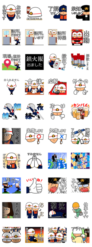 日々、訓練や予防広報お疲れ様です。団員同士での連絡に使えるスタンプです。ヘルメット・活動服・法被・軍手・綿手袋などアイテム多数。現役消防団員が作りました。