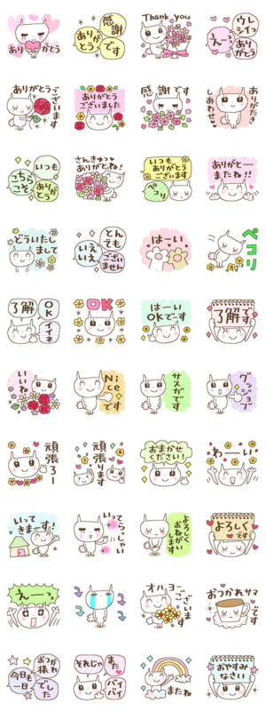 感謝の気持ちと花いっぱい、シンプルに使いやすい優しい40個。文字が大きくくっきり見やすい、大人かわいいスタンプです。挨拶やあいづち等、日常にとても便利です。