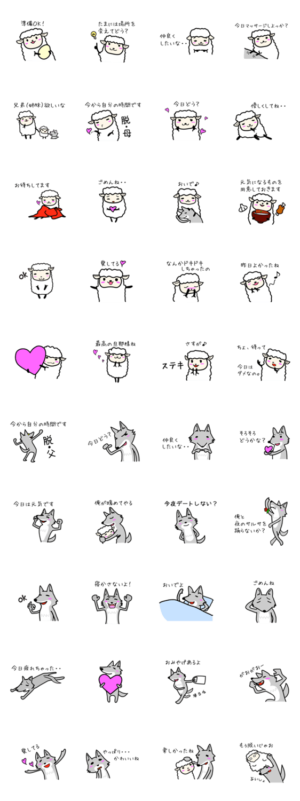 夫婦向けスタンプ(羊と狼)です。面と向かって言いにくい事を思いやりと優しさのスタンプで伝えましょう。