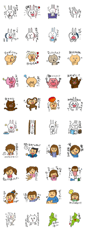 三重弁を喋る愉快な仲間たちのスタンプ、第2弾が出来たで。第1弾で、三重弁のウケの良さに味をしめた方も、そうでない方も、一緒に三重弁を広めよに。