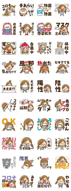 かわ主婦第48弾【STOP感染拡大編】はかわいい女の子のコロナに負けないためのスタンプです!手洗い・うがい・マスク・3密を避けて感染拡大をSTOPさせよう!アマビエ様も!