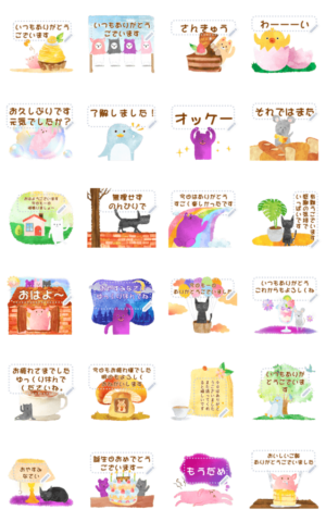 絵本のような世界のキャラクターたちのメッセージスタンプです。好きな言葉をいれて使ってください。 現在この商品は一部のスマートフォン版LINE 10.3.0以上のトークルームでのみ使用できます。動作環境の最新情報はヘルプをご確認ください。ウォームスクリエイト より発売