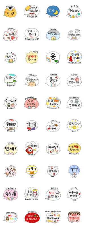 韓国語の勉強をされている方、韓国の友人に送る方、韓国アイドルが好きな方など様々な方が使用できると思います。韓国語は読めなくても小さく日本語も書いてあるのでとても親切なスタンプです。