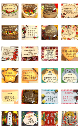 誕生ケーキに名前やメッセージを入れて特別なスタンプにして送れます。 他にも入学、卒業のお祝い、父の日、母の日、クリスマス、お正月、 様々場面でずっと使えます。 現在この商品は一部のスマートフォン版LINE 10.3.0以上のトークルームでのみ使用できます。動作環境の最新情報はヘルプをご確認ください。
