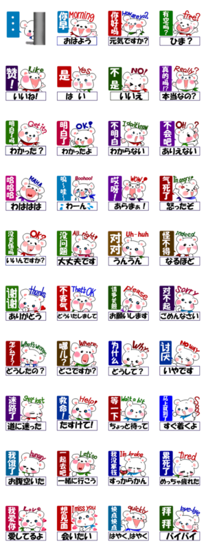 中国語(簡体字)と日本語と英語をしゃべる熊 スタンプ画像一覧