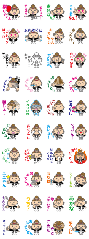 大阪の泉州弁スタンプの女性版です。汚い言葉は多いけど、愛くるしいよ。だんじり、やぐら、布団太鼓など祭り好きには、ピッタリ!