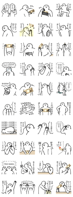 10万円欲しい人とかもらった人のスタンプです。会話めんどくさい時にも。お金は大事に使おう!/セレブ/十万円/流行語/きもい/キモい/変なスタンプ/おかね/ネタ系/oroninetoroninet より発売