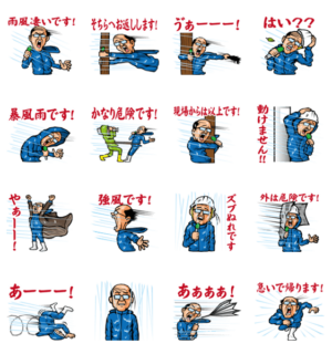 台風の現場から壮絶なリポートをするおじさんアナウンサーのスタンプです。ひろ工房 より発売